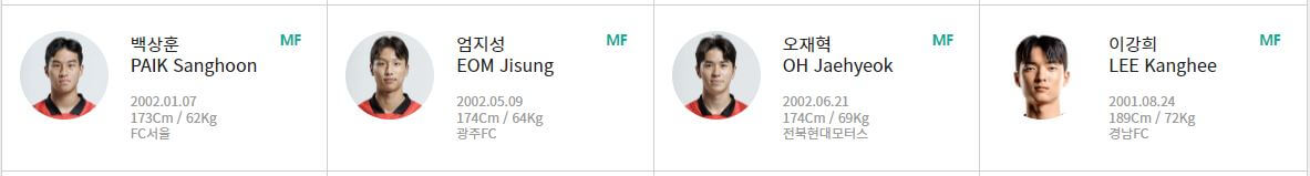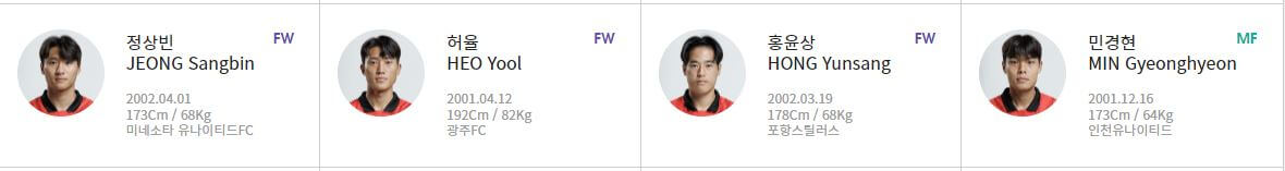 현재 성인 국가대표 선수들에 비해서는 아직 이름이 알려지지 않은 선수들이 많지만 브랜트포드의 김지수 선수나 미네소타 유나이티드의 정상빈 선수, 셀틱의 권혁규 선수 등 해외파 선수들도 포함되어 있습니다.